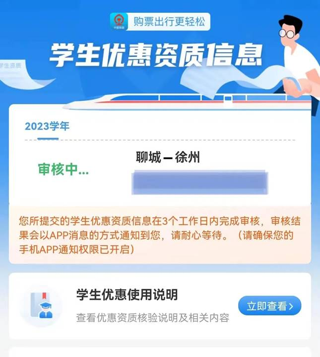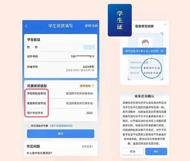 关于2025级本科新生在线核验火车票优惠资质的通知 根据《教育部办公厅 国铁集团办公厅关于进一步便利普通高等学校学生购买优惠火车票的通知》(教学厅函〔2023〕4号)精神,现将本科新生在线核验火车票优惠资质及学生证乘车区间填写要求等有关事项通知如下: 一、学生证乘车区间填写要求 各学院组织申请火车票优惠资质的学生填写《新生火车票优惠资质乘车区间统计表》(附件1,学院留存)、填写学生证家庭所在地及乘车区间,学生乘车区间应为学校所在地至家庭所在地,或父母实际居住地,学校所在地火车站填“聊城”,家庭所在地车站需按铁道购票部门规定标准的车站名称填写(以铁道部12306网站查询的站名为准),学院审核学生填报信息无误后,在学生证乘车区间页加盖学院公章。 二、在线优惠资质核验 学生在“铁路12306”APP学生专区填写个人信息及乘车区间,用于学生优惠资质核验;《新生火车票优惠资质乘车区间统计表》、学生证、“铁路12306”APP三处填写的乘车区间必须一致。 三、“铁路12306”APP学生专区填报指南 第1步:学生登录铁路12306手机客户端,右下角“我的”页面中点击“学生优惠资质核验”专区。如果当前用户是“已注册会员”或“已经在本机完成了人脸认证”则可直接点击“填写学生资质”核验学生资质信息。 第2步:根据学生证信息如实填写学校所在地车站、家庭所在地车站(申请时准确填写个人信息和与学生证上一致的优惠乘车区间!)、预计毕业年份等信息后,点击提交。提交学生资质信息后,若信息与学信网相匹配,后台将于3天内自动审核通过。 教 务 处 2025年9月17日 教育部办公厅 国铁集团办公厅关于进一步便利普通高等学校学生购买优惠火车票的通知 //www.moe.gov.cn/srcsite/A15/s7063/202306/t20230605_1062839.html
