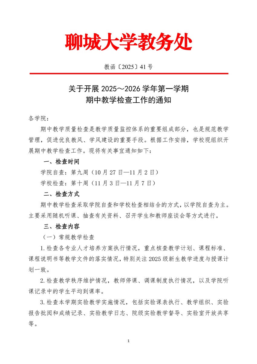 关于开展2025-2026学年第一学期期中教学检查工作的通知 相关附件:关于开展2025-2026学年第一学期期中教学检查工作的通知教函41号