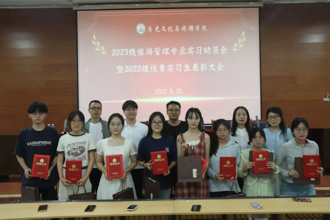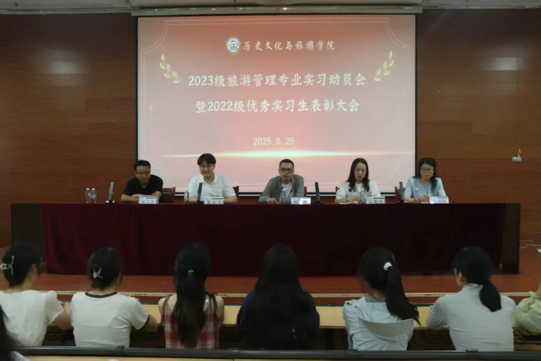 于6#106举办23级旅游管理专业实习动员会。学院团委书记石晓晗、旅游管理专业系主任张云飞、带教老师代表宋立杰、程俊峰、耿瑞琴及全体23级旅游管理专业学生参与会议。 会议伊始,由学院老师为表现优异的22级旅游管理专业实习生颁发荣誉证书,激励新一批实习生以榜样为标杆,在实习中奋勇争先。随后,带教老师代表上台发言,老师着重强调实习期间的安全与纪律问题,要求同学们务必严格遵守实习单位规章制度,在酒店服务、景区实践等工作场景中,时刻将安全放在首位,规范操作流程,保障自身及游客安全。同时,老师们叮嘱大家要以严谨的态度对待实习工作,服从单位安排,用实际行动展现学院学子的专业素养与精神风貌。 在动员讲话中,张云飞点明实习对旅游管理专业学生的重要意义,鼓励同学们在实习中实现从学生到职场人的身份转变,主动学习行业前沿知识与技能,将课堂所学融入实践。张云飞还帮助学生结合当前旅游行业就业形势,为同学们剖析实习与职业规划的紧密联系,建议大家在实习中找准自身定位,合理规划职业方向。石晓晗也强调,实习是理论与实践结合的关键契机,希望同学们明确实习目标,积极与带教老师、实习单位沟通交流,主动适应新环境,积累宝贵经验,为未来职业发展筑牢根基,同时,她也勉励全体实习生珍惜实习机会,发扬吃苦耐劳精神,在实践中锤炼本领,以饱满的热情和高度的责任感投入到旅游服务工作中。 此次动员大会的成功举办,不仅总结了22级旅游管理专业实习的成果,为23级旅游管理专业学生的实习工作指明方向,还为实习工作的顺利开展奠定了坚实基础。 (供稿:郭俊霞 摄影:于舒然 初审:于舒然 复审:张程程 终审:尤姗姗)