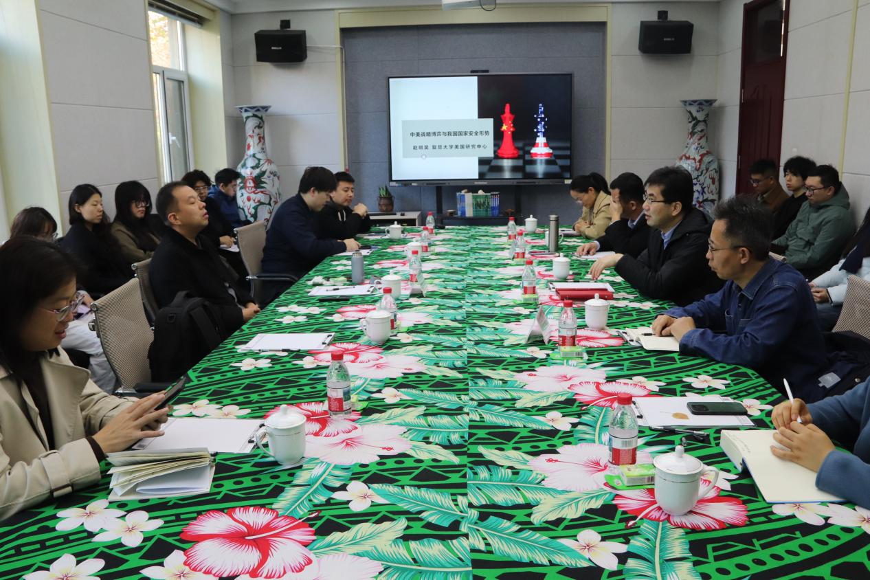 院长、太平洋岛国研究中心主任、区域国别研究院执行院长赵少峰主持,我校部分师生参会旁听。 他强调,国家安全是民族复兴的根基,必须坚定不移地贯彻总体国家安全观。赵明昊结合自身科研经验指出,做历史研究应秉持“小切口、大问题”“小切口、大关切”的研究思路,从细微处入手,聚焦重大问题与时代需求,为学术研究提供更具深度与现实意义的视角。 本次讲座内容丰富、见解深刻,使师生对中美关系的复杂性有了更深入的认识,对国家安全重要性有了更加清晰的理解,为我校区域国别研究的深化与拓展提供了创新性的思路和明确的方向指引,对相关学科建设与人才培养具有重要的推动作用。 专家介绍 赵明昊,复旦大学美国研究中心副主任、教授、博士生导师,教育部美国联合研究院副院长,入选国家级人才计划。研究领域为中美关系、国际安全与战略、大国科技竞争。兼任北京大学国际战略研究院、清华大学战略与安全研究中心客座研究员,亚太安全合作理事会(CSCAP)中国委员会委员等学术职务。曾在中共中央对外联络部长期从事国际问题研究工作。专著有《美国竞争性对华战略及其对“一带一路”的影响》《战略克制:新型中美关系的构建》。在《世界经济与政治》等CSSCI和SSCI刊物发表论文60余篇。主持国家社科基金重大项目以及国家发展改革委、外交部、科技部、商务部、军事科学院等省部级项目。撰写的决策咨询报告多次获得中央主要领导、中央政治局常委、中央政治局委员等批示。