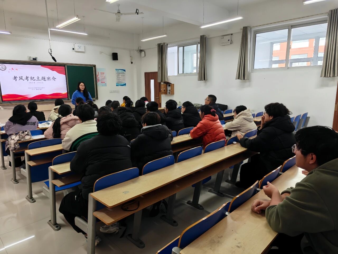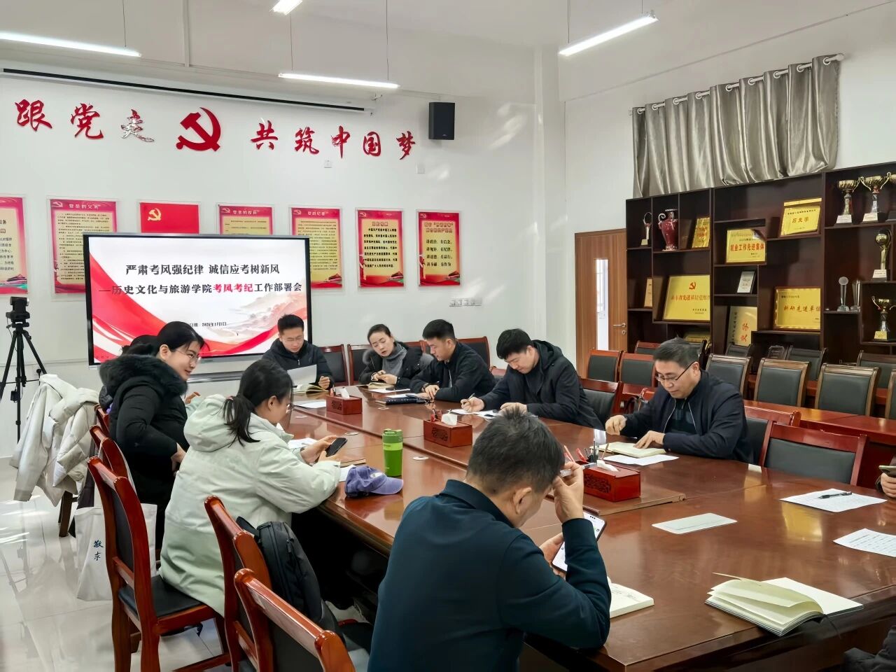 于6#A104会议室召开考风考纪工作部署会,院党委副书记、副院长卢庆洪,副院长官士刚,团委书记石晓晗和全体辅导员、班主任参加本次会议。卢庆洪在讲话中强调,期末考试是检验教学成果的重要环节,全体教师要强化责任意识,在考前教育、监考、阅卷登分等环节履职尽责,引导学生诚信应考,杜绝作弊行为。官士刚对教师监考工作提出具体要求,他强调监考教师要提前到岗,严格执行考场纪律,对考试违纪行为要敢于制止、严肃处理,确保考试过程规范有序。石晓晗明确学院责任追究机制,要求监考教师严格按照上报流程,以高度负责的态度筑牢考试公平防线。 二、主题班会:诚信立身 践行考规 在全体教师动员部署基础上,各班级迅速跟进,陆续召开考风考纪主题班会。各班班主任们结合真实案例解读考试政策,向学生详细阐述考试违纪的认定标准和处分规定。学生通过主题班会深刻认识到诚信考试的重要性,纷纷表示会自觉遵守考场纪律,以真实成绩检验学习成果。 本次活动通过"教师动员"与"学生教育"双线并行,在学院营造了"诚信考试光荣,违纪作弊可耻"的良好氛围。学院全体师生将以实际行动践行诚信准则,共同维护优良教风和学风,确保期末考试工作平稳有序进行。