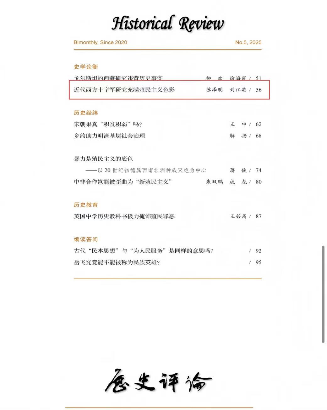 近日,苏泽明在《历史评论》(2025年第5期)发表题为《近代西方十字军研究充满殖民主义色彩》的论文。文章认为:19世纪以后,西方研究十字军的学者建构了一整套为殖民扩张摇旗呐喊的学说。在此学说框架下,十字军年东侵是文明抵御野蛮的正义战争,十字军侵略者与被侵略者结成“共生关系”,西方的封建制度是“共生关系”之因,与“东方专制主义”下的野蛮统治形成鲜明对比。