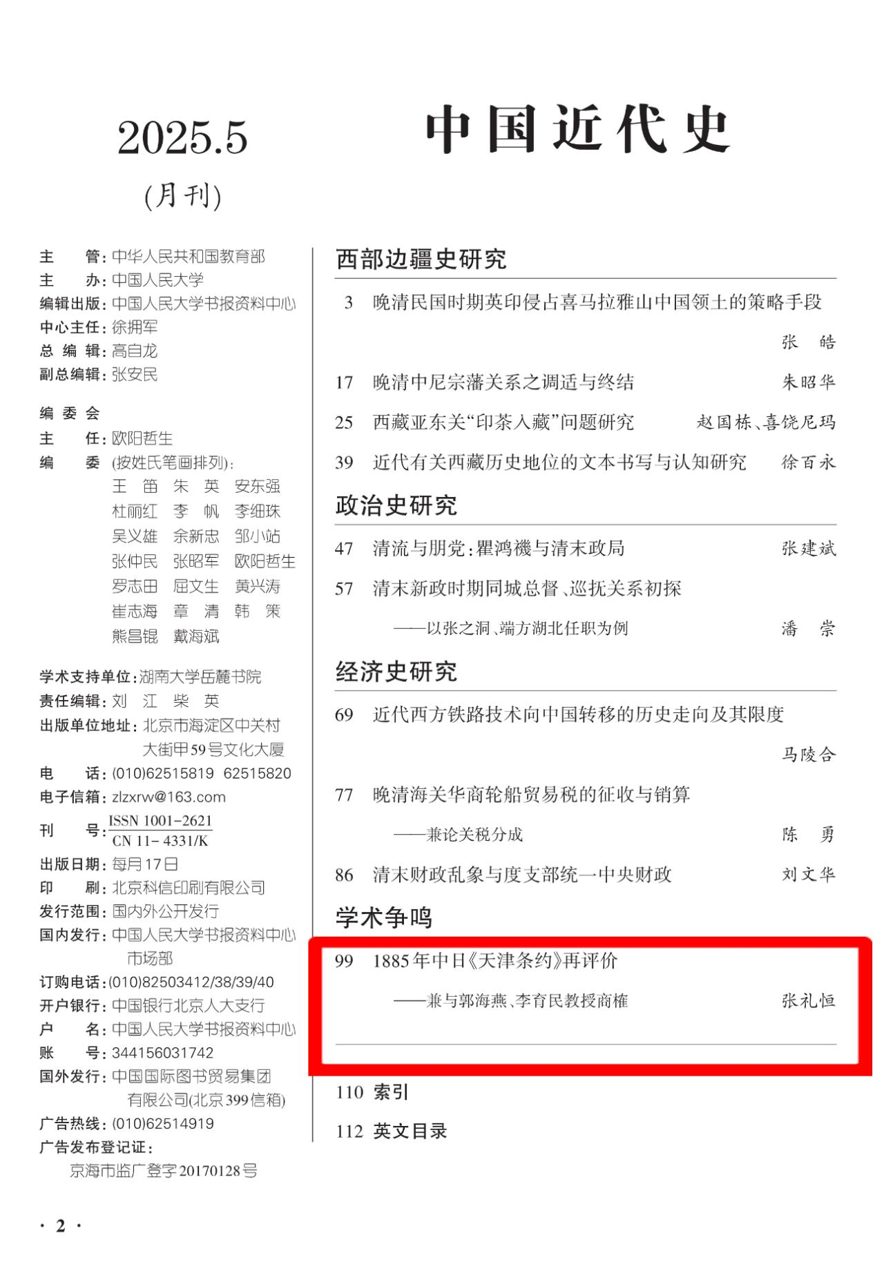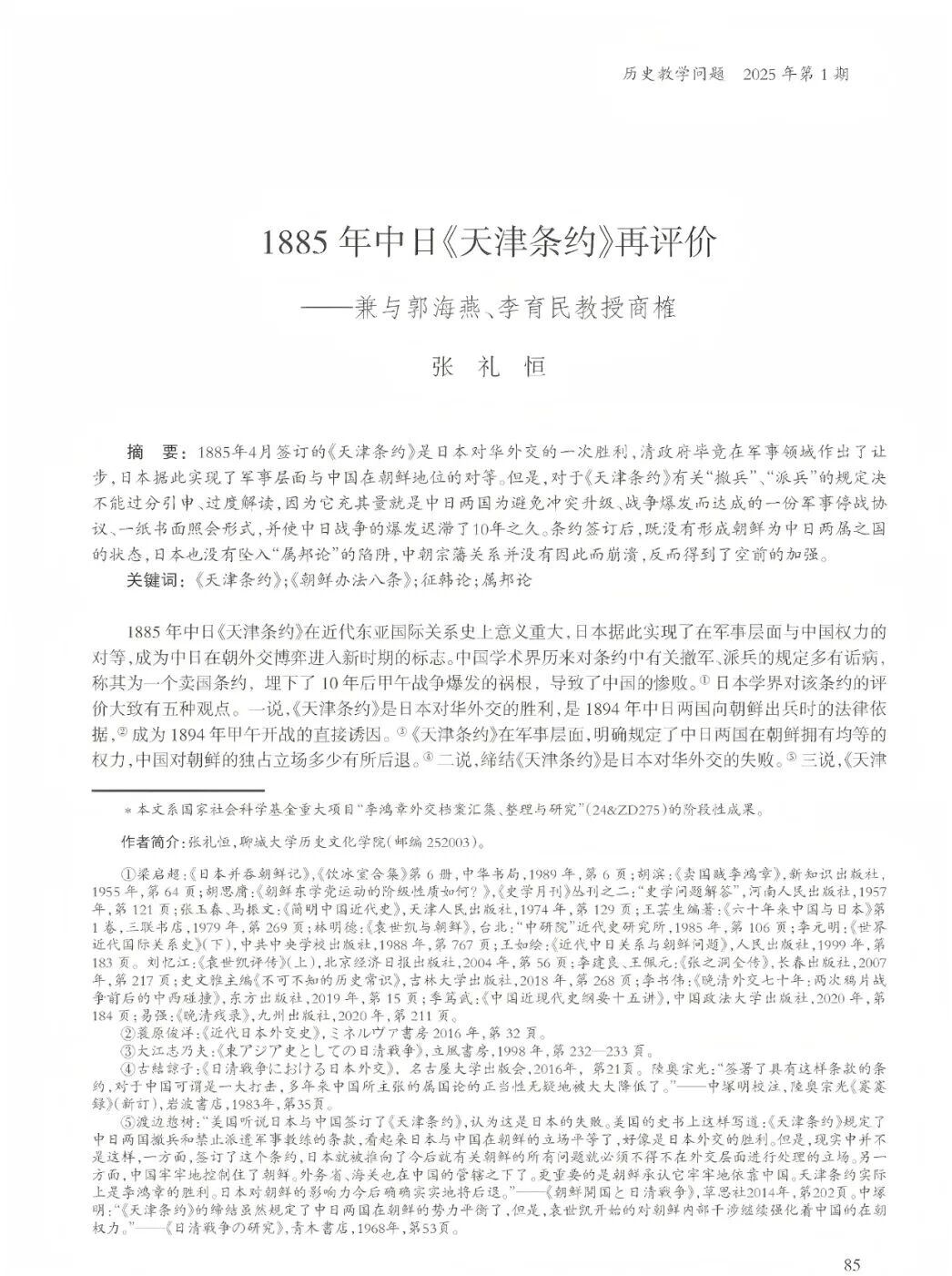 张礼恒教授发表于《历史教学问题》2025年第一期的论文《1885年中日〈天津条约〉再评价——兼与郭海燕、李育民教授商榷》被中国人民大学《复印报刊资料·中国近代史》2025年第5期全文转载。 文章指出,1885年4月签订的《天津条约》虽为日本对华外交的一次胜利,使清政府在军事领域作出让步,日本据此实现了军事层面与中国在朝鲜地位的对等,但对于条约有关“撤兵”“派兵”的规定决不能过度解读,其本质是避免冲突升级的军事停战协议,成功迟滞中日战争10年。针对“条约导致朝鲜沦为中日两属之国”“中朝宗藩关系崩溃”等传统认知,论文通过史实论证予以驳斥,明确条约签订后中朝宗藩关系非但未瓦解,反而得到空前加强,日本所谓“陷入‘属邦论’陷阱”的说法缺乏史实依据。此外,论文还梳理了日本试图通过《朝鲜办法八条》实现对朝鲜共管的战略企图,分析其因触及清政府核心利益而最终破产的过程,将其置于明治日本侵朝的长时段历史脉络中,进行客观理性的历史评判,为近代东亚国际关系史与中日甲午战争相关研究提供了新的学术视角。 人大复印报刊资料是中国人文社科领域极具影响力和核心竞争力的二次文献期刊门类。中国人民大学复印报刊资料转载论文是从国内公开出版的6000多种专业特色报刊中精选出的社科研究成果,是评价人文社会科学期刊学术影响和人文社会科学研究成果水平的重要参考依据。篮球预测
