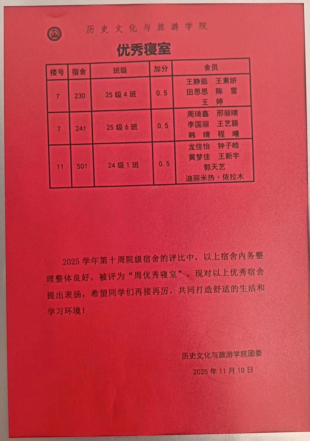 于群星公寓举办“院级宿舍”评比活动。本次活动通过评选优秀宿舍典型,引导同学们以寝风促学风,共同构建温馨和谐的生活环境,展现当代大学生朝气蓬勃的精神风貌。 本次活动的顺利举办,不仅能够引导同学们在宿舍生活中更加自律,培养其健康的生活习惯,还有利于营造温馨和谐的宿舍环境,提升同学们的校园生活幸福感。 (供稿:篮球预测-NBA篮球比分预测-CBA篮球比赛预测