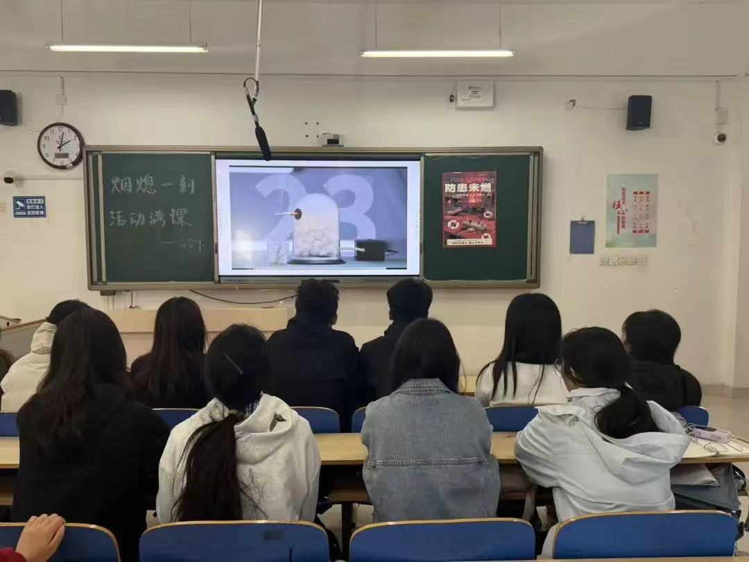 于6#A303教室举办“烟熄一刻,活力满课”禁烟宣传活动。 禁烟宣传员结合校园实际场景,细致深入地剖析吸烟带来的危害。宣传员表示,烟草中的化学物质会对人体造成不可逆的损伤,且未熄灭的烟头极易引燃易燃物品,给校园公共安全埋下隐患。 宣传员组织学生观看禁烟教育影片,影片内容全面深入,通过生动的画面和真实的案例,让学生直观地感受到吸烟的危害,增强学生的禁烟观念和敬畏意识。针对校园火灾应急处置,宣传员强调,火情发生时需保持冷静,切忌慌乱,应牢记火灾逃生原则,根据周围环境采取相应的逃生路径,并及时发出求救信号。 在交流分享环节,学生结合活动所学,对禁烟与消防知识进行系统总结。他们纷纷表示通过本次活动不仅对烟草的危害有了更为全面的认知,更熟练掌握火场实用逃生技能,进一步理解“防患未然”的安全理念。在展板签字环节,学生在“无烟承诺”展板上郑重签字,承诺未来将主动参与禁烟活动,推动构筑校园无烟环境。 本次活动的顺利举办,不仅帮助学生深化对烟草危害的全方位认知,使其切实意识到营造无烟校园环境的重要性,而且有利于加强学生的消防安全与禁烟意识,推动学生成为禁烟行动的坚定倡导者与消防安全的主动守护者,为营造健康和谐的校园环境贡献力量。 (供稿:朱研 张诺 陆雅馨 初审:陆雅馨 复审:宋佳珊 终审:尤姗姗)