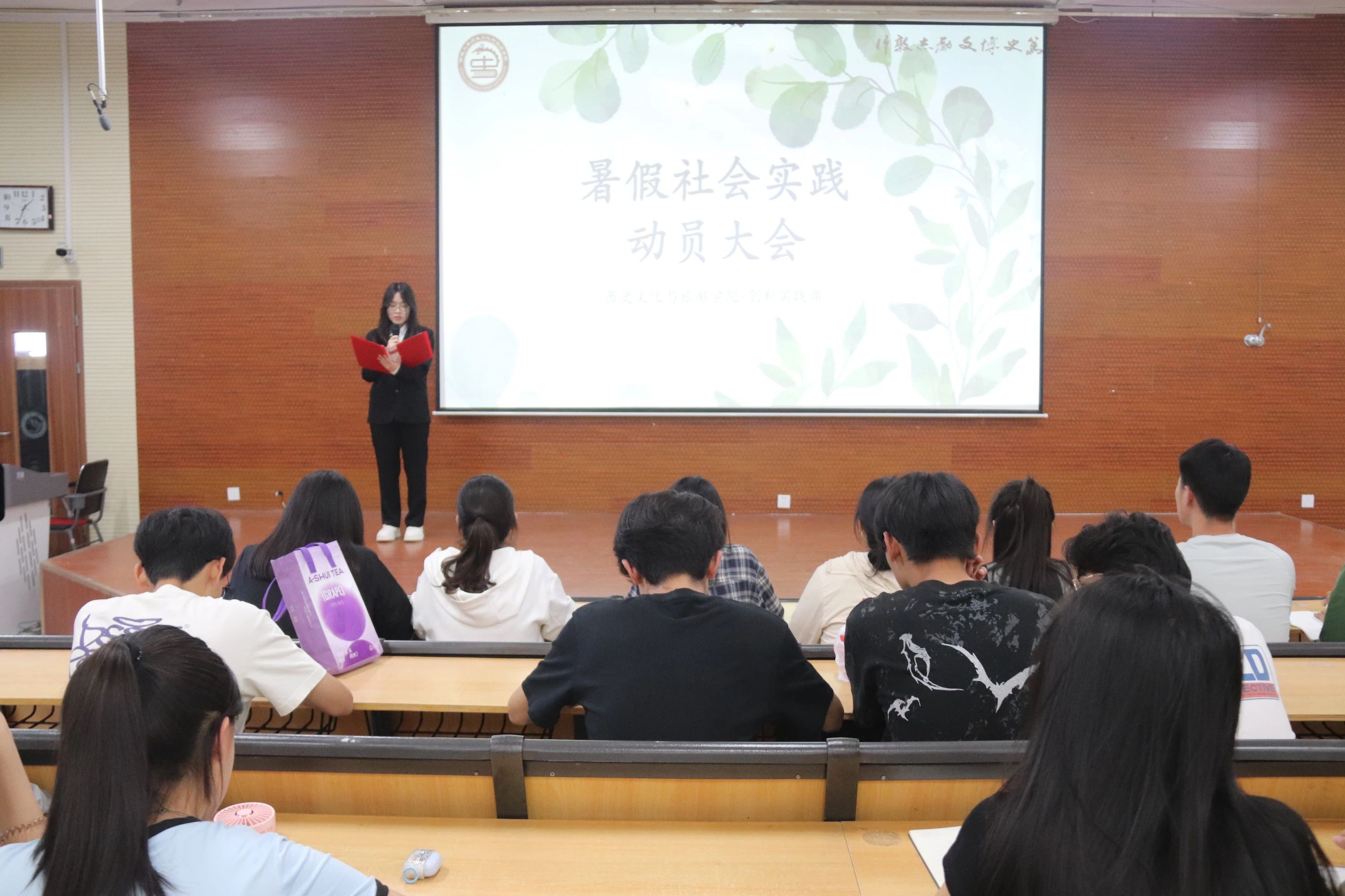 于6#106报告厅举办暑假社会实践动员大会。学院各班级及部门代表参与此次大会。 会上,主持人指出社会实践活动对同学们成长的重要意义,鼓励同学们积极投身实践,将理论知识与实际相结合,在实践中锻炼自己。杨萧霏详细介绍了社会实践活动的选题方向和写作要求,指出社会实践新的要求,要以“用青春为中国式现代化挺膺担当”为主题开展社会实践,建议同学们合理安排实践时间,确保实践活动高效有序推进。李炜恒对调研报告的撰写进行了细致讲解,强调报告的字数不少于2万字,查重率低于20%,需要以附件形式提交查重证明。同时,她指出调研报告要注重数据的真实可靠,可以适当运用图表等形式,使报告内容更加直观明了。孔晨骞介绍了志愿服务纪实册的要求,提醒同学们注意纪实册的结构和字数要求,同时提到了今年的社会实践需要各团队申报校级重点,并鼓励同学们创新性开创新的实践模式。王瑞雪就PPT、视频的制作以及评分细则进行了说明。她指出,PPT和视频的内容要围绕实践主题,突出重点,建议通过生动的展示方式,增强作品的吸引力和感染力。此外,她对评分细则中的各项指标进行详细解读,以便同学们在实践活动中有所侧重。 本次大会的顺利举办,不仅加深了同学们对社会实践活动的认识和理解,明确了实践的目标与方向,还有效激发了同学们参与社会实践的热情,为即将到来的暑假社会实践活动奠定了坚实基础。 (供稿:郭俊霞 摄影:郭俊霞 初审:于舒然 复审:张程程 终审:尤姗姗)