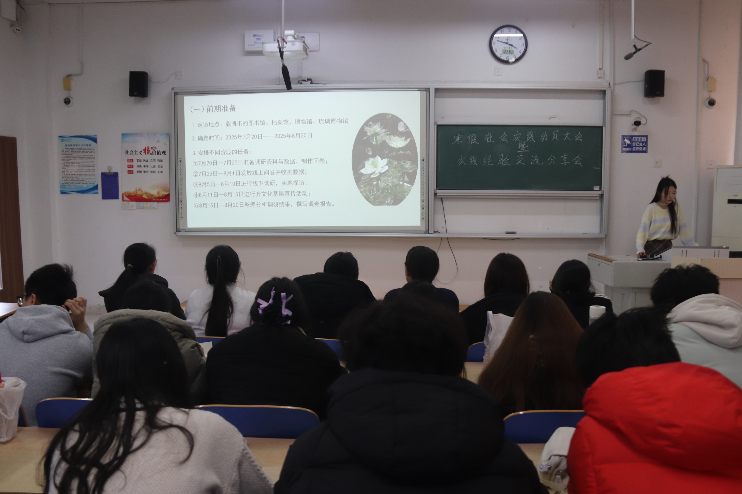 为激发同学们参与社会实践的热情,保障寒假社会实践活动有序开展,12月27日,我院于6#A502教室举办寒假社会实践动员大会暨社会实践经验交流分享会。 为确保同学们充分理解社会实践的各项要求,工作人员依次进行细致的讲解。涂安琪讲解社会实践选题方向与活动主题的写作要求,强调选题需兼具创新性与可行性;段研古详细说明调研报告的撰写规范,并指出高质量的报告应具备清晰的逻辑结构,需层层递进、论证严谨;李欣怡聚焦志愿服务纪实册,提醒同学们注重项目与专业技能的融合;程佳琦介绍PPT的制作要领与评分细则,强调设计应简洁大方、重点突出;赵义鑫阐述实践视频的具体要求;罗佩华讲解活动拍照与新闻稿的写作规范。 在实践经验分享环节,两支全国专项优秀团队的代表倾囊相授。“欢声‘孝’语·普润凤阳”苔花筑梦推普志愿团的李思玮分享如何深度挖掘文化资源,将推广普通话工作与地方特色巧妙结合,打造出既有温度又具影响力的实践项目。“稷下青衿”调研服务队的程佳琦则以齐文化传承为案例,介绍团队如何通过线上线下相结合的方法进行扎实调研,最终形成高质量的调研成果。 本次动员大会暨经验交流分享会的顺利举办,不仅解答同学们关于社会实践的诸多疑问,激发同学们的参与热情与积极性,而且有助于同学们在实践中锤炼本领,为社会发展贡献青春力量。 (供稿:高越 初审:罗佩华 复审:宋佳珊 终审:尤姗姗)