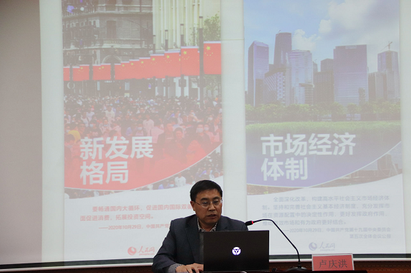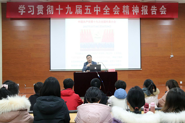 于6号教学楼A106报告厅举行学习贯彻十九届五中全会精神报告会。我院党总支副书记卢庆洪担任报告会主讲人,会议由团委书记李姮主持。 卢书记以“深入学习贯彻党的十九届五中全会精神,勇担民族复兴大任”为题,全面深刻解读了十九届五中全会的会议精神。报告会中,卢书记带领同学们回顾“十三五”以来党和国家事业发展取得的10项决定性成就。 卢书记旁征博引,借助数据和实例,从脱贫攻坚、粮食年产量、污染防治、对外开放、疫情防控、军队建设和国家安全等方面对我国所取得的成就进行具体阐述。随后,卢书记分析了我国国际和国内发展环境面临的深刻复杂变化,并从四个具体的方面为同学们讲解国内外的发展环境. 会上,卢书记具体地阐述了2035年社会主义现代化的十大远景目标,并对“十四五”经济社会发展主要目标和12项重大举措进行了深入解读,分析“十四五”时期经济社会发展的指导思想和五大原则。 报告最后,卢书记呼吁新一代大学生要在人才强国中勇担民族复兴大任,并对同学们寄予期望,希望同学们要不忘初心跟党走,弘扬爱国主义精神,勤奋学习,敢于创新,努力提高自身综合素质。