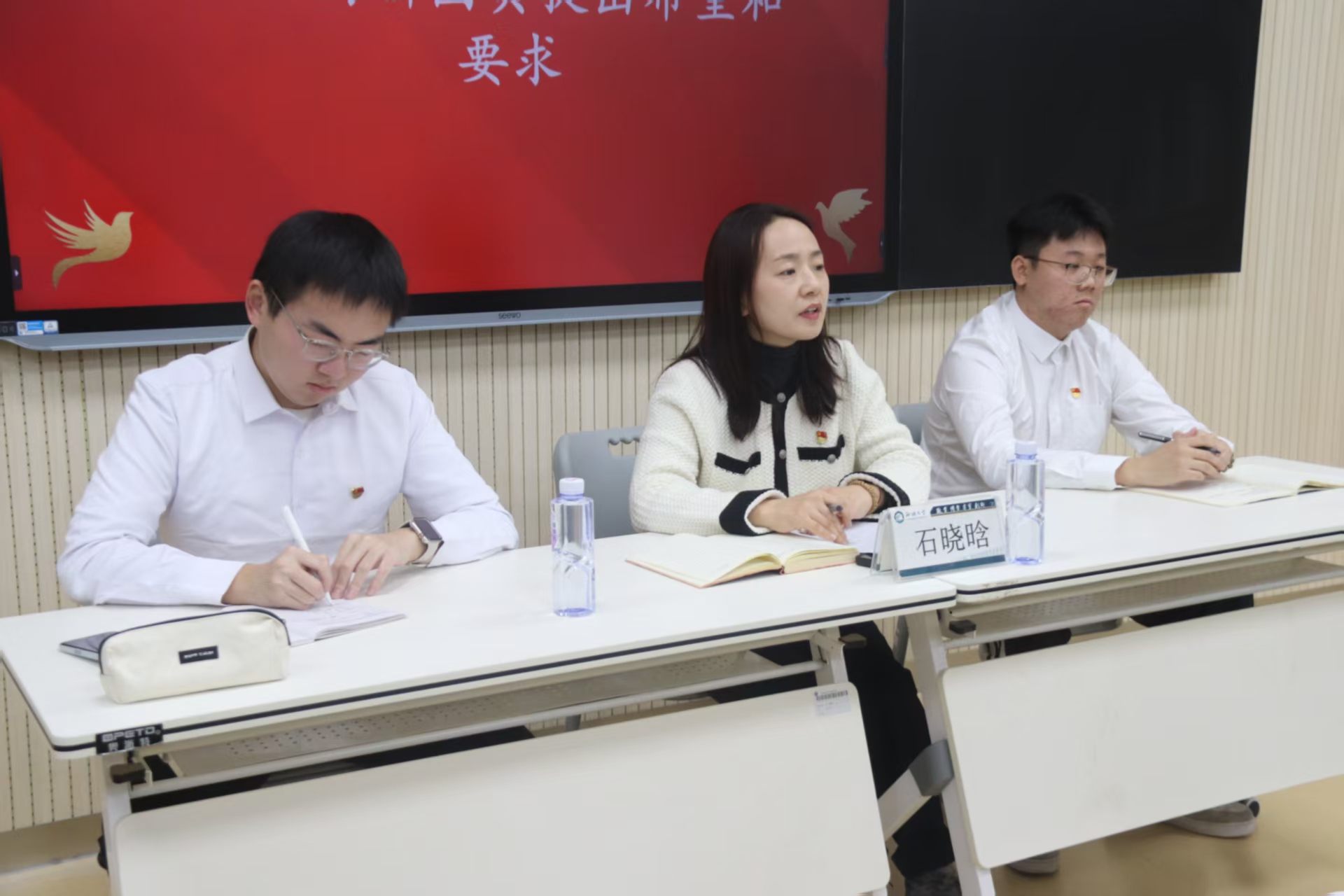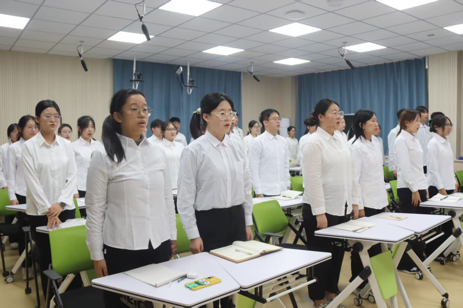 于6#A401教室举办“赓续红脉承团训,秉志青春赴锦程”新团员入团仪式。学院本科生党支部书记石晓晗,党员代表牛博、韩明宇,优秀团员代表及新发展团员参加本次新团员入团仪式。 激昂的国歌旋律响起,全体人员肃立高唱,入团仪式正式拉开序幕。主持人宣读新团员名单,经团组织系统培养与严格考察,32名先进青年被发展入团。石晓晗、牛博、韩明宇为新团员颁发团员证与团徽徽章。 优秀团员代表侯山山勉励新团员珍惜身份,以先锋标准要求自己,做到勤学善思、明辨笃行,以过硬本领回应时代召唤。新团员代表乔涵表示,入团不仅是身份的转变,更是责任的接力,未来将坚定理想信念,争做合格的共青团员。 石晓晗围绕新时代青年的成长要求,向新团员提出三点期望:一是坚定理想信念,筑牢原则底线,始终把个人追求融入国家发展与民族复兴的大局;二是彰显先锋本色,主动投身各类竞赛与实践项目,在创新创业中锤炼本领,在艰苦奋斗中磨砺意志;三是坚守入团初心,立足本职岗位服务同学,积极承担社会责任,努力成长为有理想、有担当、能吃苦、肯奋斗的新时代好青年。 全体同学放声齐唱《中国共青团团歌》,入团仪式在振奋人心的氛围中圆满落幕。 本次入团仪式的成功举办,不仅为团组织注入新鲜血液,凝聚集体力量,而且促进新团员顺利完成身份转变,从而进一步增强团员对团组织的归属感,助力其在强国建设、民族复兴的伟大征程中挥洒青春汗水、书写青春答卷。 (供稿:郭艺泽 摄影:张旭 郭艺泽 初审:郭艺泽 复审:宋佳珊 终审:石晓晗 尤姗姗)