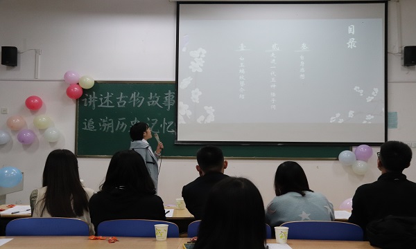 于政史楼A503教室举办“讲述古物故事,追溯历史记忆”演讲比赛。 活动开始前,主持人先借助视频简单介绍了文物的当代价值,并对本次活动的评分规则加以说明。十二位参赛者按照自己的序号依次上场,讲述自己带来的文物故事。第一位参赛者以海晏堂为引,讲述了圆明园十二铜兽首的流散与回归,另一位参赛者则以石和玉的比较,引入对“子冈白玉螭纹簪”的介绍。参赛者生动鲜明的讲解和流畅活泼的语言赢得阵阵掌声。比赛进行到中场游戏环节,一曲《同桌的你》调动起全场气氛,将比赛带到高潮。在下半场活动中,参赛者身着与所讲绢衣彩绘木俑相配的服饰,通过舞蹈生动地展现出绢衣之美。清明上河图、后母戊鼎等文物也在参赛者的介绍中重新焕发生机,让同学们感受到古物的魅力。 在评委们仔细合计分数后,主持人宣布比赛结果,三等奖由宋鹏飞、孙至真和国晓旭同学获得,二等奖获得者为梁权和陈雅琪同学,谷胤奇同学荣获一等奖,比赛随结果的公布落下帷幕。 本次比赛的成功举办,不仅调动了同学们对历史文物的兴趣,而且让同学们认识到文物背后所包含的文化、艺术等多种内涵,有利于促进文物背后民族文化的传承和发展。(通讯员 冷林春 姜广冕)