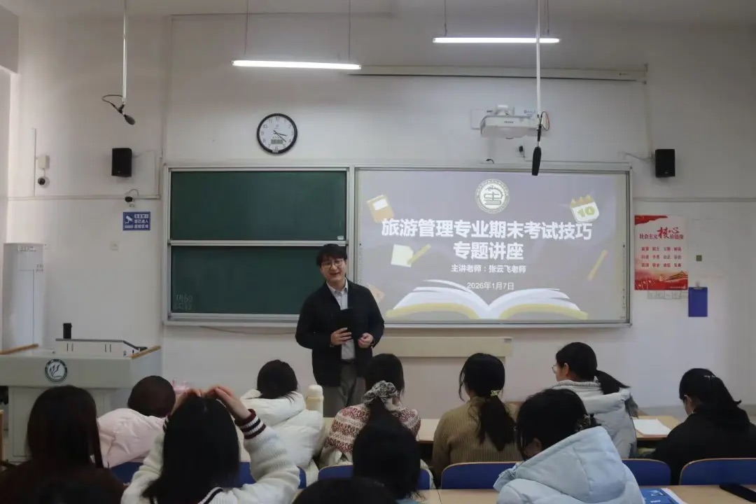 于6#A503教室举办旅游管理专业期末考试技巧专题讲座,由张云飞老师担任本次讲座的主讲人。 本次讲座以“诚信备考,高效冲刺”为核心,张云飞重点强调考场纪律红线,明确讲解携带手机等通讯设备进入考场即直接认定为作弊的硬性规定,详细解读作弊行为对评奖评优、学籍档案、升学就业等方面的严重影响,引导学生树立“诚信应考为荣,违纪作弊为耻”的观念,筑牢思想防线。张云飞邀请大二优秀学姐带来实战经验分享。学姐分享拆解知识框架搭建方法、笔记整理技巧、不同题型的答题策略,以及考前时间规划、心态调整等实用心得。张云飞针对本学期各科目考试题型、分值分布、核心考点进行解读,传授解题思路与答题规范,助力学生明确复习方向,提升备考效率。同时,他梳理通用应考技巧,包括考前物品准备清单、考场时间分配原则、难题应对方法等。 本次期末考试技巧专题讲座的顺利举办,不仅有利于为学生明确复习方向、提高备考效率,缓解学生考试焦虑,也有利于强化学生考风考纪意识,营造公平公正的考试氛围。 (供稿:肖晶晶 摄影:刘乘希 初审:黄博雨 复审:魏志鹏 终审:尤姗姗)