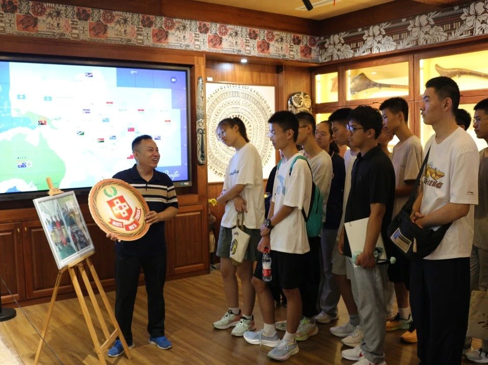 8月20日,聊城市第一实验学校高中部的102名学生(3组)走进中国—太平洋岛国应对气候变化合作中心、聊城大学太平洋岛国研究中心(简称“中心”),在研究人员孙学美、田肖红、张剑锋老师的带领下,开展了一场富有教育意义和思想深度的参观研学活动。此次活动不仅为学生打开了认识太平洋岛国的一扇窗,拓宽了他们的国际视野,还帮助他们深入了解了二战期间中国人民与太平洋岛国人民共同抗击侵略者的历史。 孙学美博士为学生们系统介绍了中心的成立背景及其服务国家战略的重要意义。她讲解到,中国—太平洋岛国应对气候变化合作中心虽坐落于聊城大学并由该校负责日常运行,却是由外交部、生态环境部和山东省人民政府共同建设的国家级机构。它是中国在太平洋地区推进特色大国外交的具体实践,体现了中国作为负责任大国,在应对气候变化问题上与岛国携手合作的决心与担当。聊城大学太平洋岛国研究中心作为国内首个独立建制的太平洋岛国研究机构,凭借扎实的学术研究与精准的资政服务,为国家处理与岛国关系、推动构建中国—太平洋岛国命运共同体提供了重要的智力支持。孙学美高屋建瓴的讲解,激发了学生们的民族自豪感和以学术报国的志向。 在主题文化展厅,田肖红博士带领学生们进行了一场沉浸式的太平洋岛国历史文化之旅。从斐济纳瓦拉村落的“部落微缩景观”,到古老的树皮布与树皮画技艺;从富有社会意义的卡瓦酒与卡瓦仪式,到威猛的传统武器和精美的编织工艺品;再到体现航海智慧的带舷外支架独木舟,以及丰富多彩的邮票与钱币——每一件展品背后都蕴藏着生动的文化故事。田肖红极富感染力的讲解,让遥远国度的历史脉络、文化精髓与生活风貌变得清晰可触。同学们不仅感受到世界文明的多元绚烂,也更加理解了尊重文化差异、促进文明互鉴的深刻意义,国际视野在直观体验中得到了显著提升。 张剑锋老师结合自己在萨摩亚、汤加的从教经历,为学生们带来了一场深情而真挚的分享。他从语言学和人类学的视角,剖析了中国与波利尼西亚文化之间可能存在的悠久联系,增强了大家对跨文化渊源的认识。更令人动容的是,张老师以质朴的语言,讲述了在异国克服困难、传播友谊、践行使命的点点滴滴,生动诠释了“奉献祖国、大爱无疆”的崇高精神。他的经历本身就是一堂深刻的爱国主义教育课,鼓励同学们树立远大理想,将个人成长融入国家发展,锻造坚定的爱国信念,未来无论身在何方,都心系祖国,为民族复兴与人类命运共同体建设贡献力量。 本次活动获得了聊城市第一实验学校师生的一致好评。大家认为,中心三位老师的讲解成功将国家战略、学术前沿、异域文化与爱国主义教育融为一体,不仅拓宽了学生知识视野,更在他们心中种下了胸怀家国、勇于担当的种子。作为连接中国与太平洋岛国的桥梁,中心所展现的使命感与责任感,深深感染了每一位学子,为他们成长为具备国际视野与深厚家国情怀的新时代青年注入了强劲动力。未来,中心将继续积极开展多样化的青少年参观访学活动,助力更多青少年拓宽视野、厚植情怀,在世界舞台上讲好中国故事。