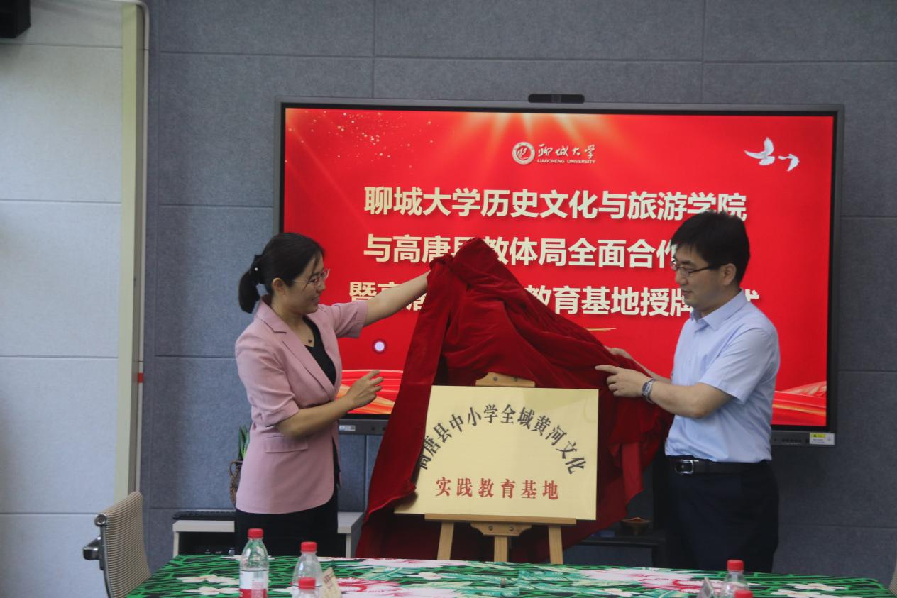 与高唐县教体局全面合作协议书》。赵少峰与马芮共同为“高唐县中小学全域黄河文化实践教育基地”揭牌。 此次与高唐县教体局全面合作协议的签订,是双方深化院地合作、共建实践教育基地平台的重要举措,为聊城大学与高唐县教体局进一步交流合作奠定了坚实基础。下一步,学院将以实践教育基地为依托,充分发挥其在人才培养中的重要作用,为教学科研及人才培养工作提供有力支撑,推动校地协同体育人迈向新台阶。