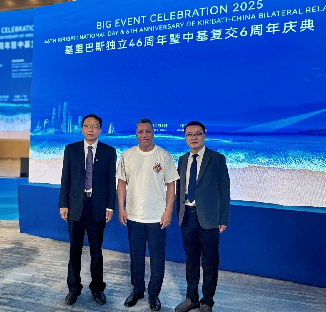 2025年11月1日,基里巴斯独立46周年暨中基复交6周年庆典在广州隆重举行。本次活动由基里巴斯共和国旅游、商务、工业和合作部、基里巴斯驻华大使馆及中国商业股份制企业经济联合会平台经济专业委员会联合主办。中国-太平洋岛国应对气候变化合作中心(以下简称“气合中心”)常务副主任陈德正教授、聊城大学太平洋岛国研究中心副主任刘建峰教授,以及气合中心示范企业代表王瑞应邀出席,与基里巴斯驻华大使戴维·蒂阿博阁下、基里巴斯旅游、商务、工业和合作部部长坦加里基·里特阁下,以及中基两国政府与企业代表齐聚一堂,共商合作大计,擘画未来发展蓝图。 戴维·蒂阿博大使在致辞中表示,尽管中基两国远隔重洋,却因“身份认同、坚定支持与共同责任”而紧密相连。他希望以复交6周年为新起点,进一步拓展旅游、渔业、交通等关键领域的合作,推动双边关系持续健康发展。这一愿景与气合中心致力于深化中国与太平洋岛国务实合作的使命高度契合。 庆典现场举行了庄重的祈福仪式,中基两国国歌奏响,并安排了献花环节。活动回顾了复交以来双方取得的丰硕合作成果,并对未来合作前景进行了积极展望。此次庆典不仅为中基企业搭建了高效务实的对接平台,明确了旅游、渔业、交通等重点合作方向,也进一步促进了两国政府与民间的友好交流,为双边经贸合作高质量发展注入了崭新动力。 自中基复交以来,气合中心持续推动两国在应对气候变化领域的合作。2025年7月24日至26日,气合中心专家小组应基里巴斯政府邀请,赴当地开展了为期三天的专项调研,深入考察气候变化对基里巴斯的影响,并积极探索双边合作路径,切实落实第三次中国—太平洋岛国外长会共识。展望未来,气合中心将继续推进与基里巴斯在气候变化领域的合作研究,并推动示范企业开展务实高效的项目合作,为中基友好关系续写新的辉煌。