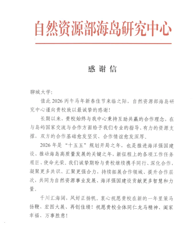 2月10日,自然资源部海岛研究中心向聊城大学发来感谢函,高度肯定双方在科研协同、业务交流等领域取得的丰硕成果。函件指出,面向“十五五”规划新时期,双方将紧扣国家海洋发展战略需求,进一步拓展合作维度、提升协同能级,携手为自然资源事业高质量发展与海洋强国建设贡献智慧与力量。 作为我国区域国别研究尤其是小岛屿国家研究领域的重要高地,聊城大学与海岛研究中心持续深化战略联动。2025年12月,双方正式签署战略合作协议,聚焦国际合作、区域国别研究、海岛文化遗产保护及高层次人才培养等方向,着力构建跨学科学术创新体系,强化决策咨询服务能力,推动研究成果从学术突破向政策实践高效转化。 双方合作以世界海洋研究为宏观视野,以小岛屿国家研究为核心支点,系统布局全球海洋治理前沿议题。近年来,聊城大学与海岛研究中心联合策划并申报国家级重大课题,围绕中国与太平洋岛国在海洋科技、气候变化应对、防灾减灾等关键领域,共同探索创新合作机制,务实推动中国—太平洋岛国人类命运共同体构建。 此次感谢函的送达,既是对既往合作成效的高度认可,更标志着双方合作迈入战略引领、系统推进的新阶段。立足新起点,聊城大学将持续发挥区域国别学、系统科学、生物学等特色学科优势,与海岛研究中心同向发力,深度服务国家海洋发展战略,为构建海洋命运共同体贡献更多“聊大智慧”与“聊大方案”。 (审核 赵少峰)