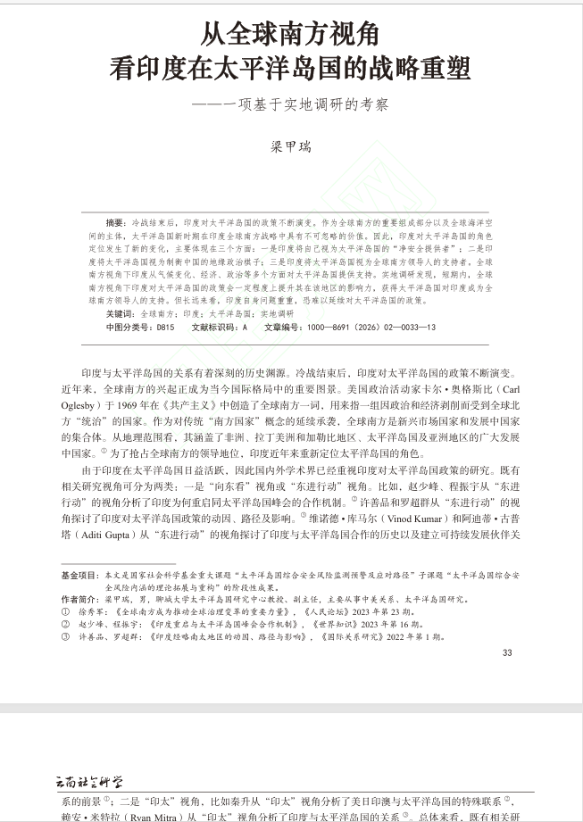 近日,梁甲瑞教授在《云南社会科学》2026年第2期发表题为《从全球南方视角看印度在太平洋岛国的战略重塑——一项基于实地调研的考察》的学术论文。文章依托作者近年来在斐济、萨摩亚、瑙鲁、基里巴斯、帕劳等太平洋岛国开展的实地调研,以全球南方为理论视角,系统剖析印度在太平洋岛国的角色定位与战略意图,梳理其相关政策实践与推进路径,为中国在太平洋岛屿地区妥善处理与印度的关系、开展务实合作提供学理参考与对策建议。 文章认为,从历史脉络与现实格局来看,印度在斐济拥有广泛的印度裔社会基础,其在当地的影响力在一定程度上超过中国。基于这一条件,印度试图将斐济打造为其面向太平洋岛国传播全球南方叙事的战略支点,并以斐济为核心支柱,逐步将影响力辐射至其他岛国。
